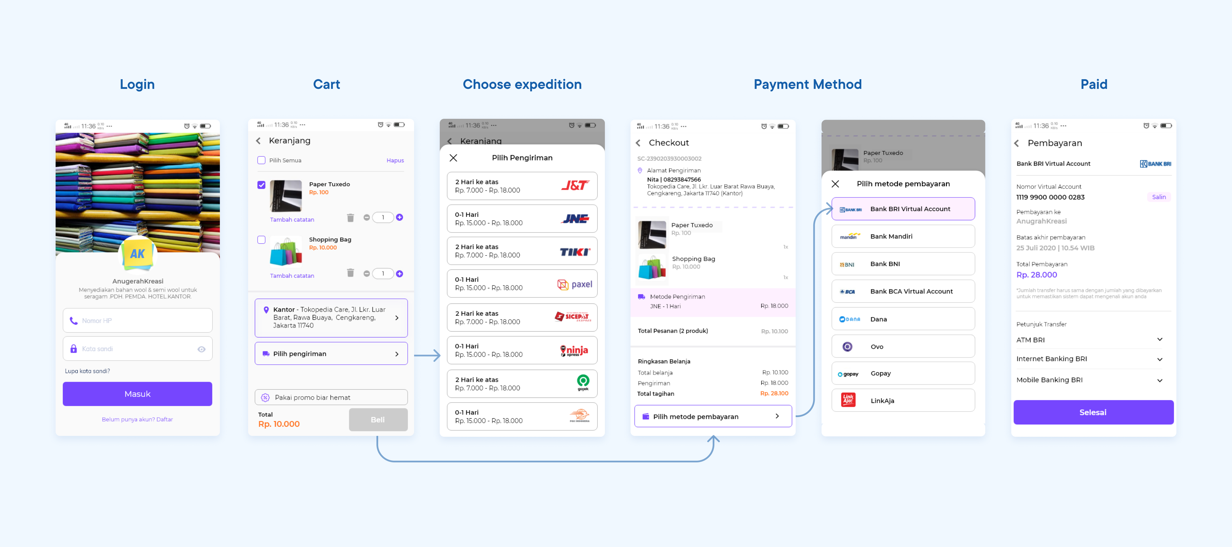 Based on the requirement, I do exploration only in the homepage shop, category, profile merchant and detail product. The flow checkout process still uses the same current system, only changes the style guide; font, colors and buttons.